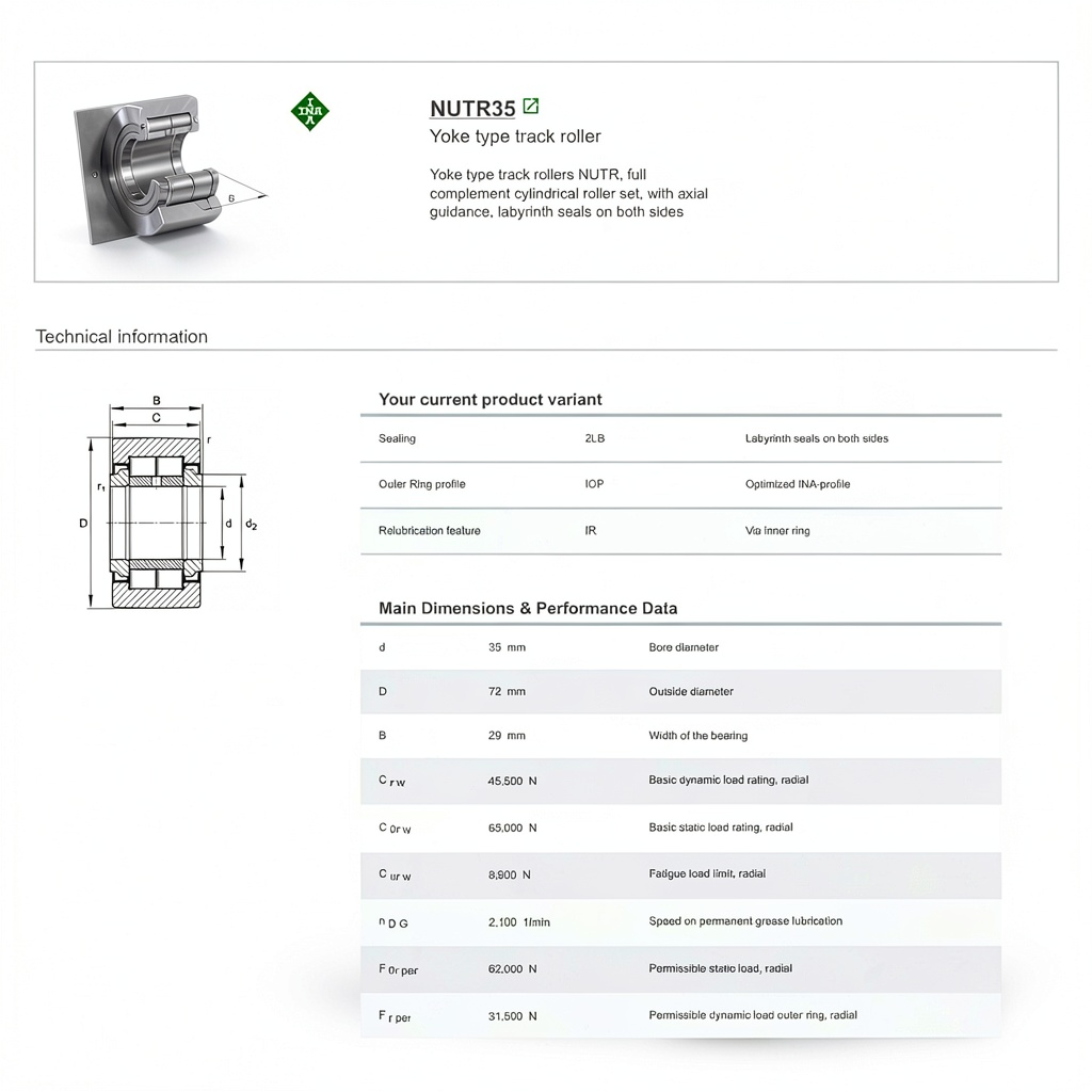 The NTNSKFAGINAIKO yoke type track roller bearing is engineered for high-performance industrial applications, featuring a full complement cylindrical roller set that maximizes load distribution and efficiency. Constructed from premium bearing steel, this bearing ensures exceptional durability and resistance to wear, with axial guidance labyrinth seals on both sides to protect against contaminants and extend service life. Key specifications include dimensions of 35mm x 72mm x 29mm, a model number of NUTR35-X-A, and a weight of 1.39 pounds, making it suitable for precise integration into machinery where space and reliability are critical. Its design supports heavy radial loads and can handle relatively heavy axial loads due to tilting or tipping, providing versatile and robust performance in various industrial settings.